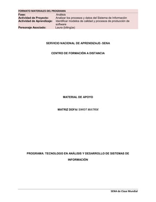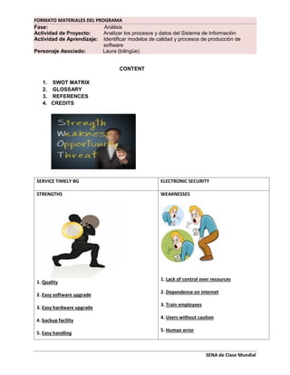 El documento presenta una matriz DOFA para analizar el sistema de seguridad electrónica de tiempo de respuesta rápida. La matriz identifica las fortalezas como la calidad, facilidad de actualización de software y hardware, y facilidad de uso, mientras que las debilidades incluyen la falta de control sobre los recursos y la dependencia de Internet. Las oportunidades son servicios de almacenamiento, seguridad y software de oficina, mientras que las amenazas son la piratería, ataques de virus informáticos y errores de programación y diseño.