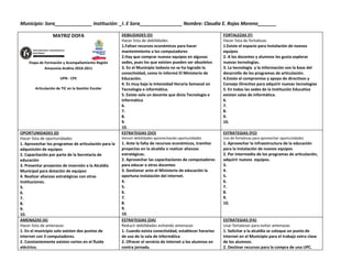 Este documento presenta una matriz DOFA para analizar las debilidades, fortalezas, oportunidades y amenazas relacionadas con el uso de las tecnologías de la información en una institución educativa. Entre las debilidades se encuentran la falta de recursos económicos y equipos obsoletos. Las fortalezas incluyen el compromiso de adquirir nuevas tecnologías y la infraestructura existente. Las oportunidades son programas de articulación y capacitación. Las amenazas son la falta de conectividad e internet y los cort