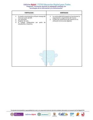 Este documento presenta una matriz DOFA para analizar la situación interna y externa del nuevo Ambiente de Aprendizaje Tecnológico del proyecto TIT@ EDPT. Identifica debilidades como la falta de implementos adecuados en el aula digital y conexión Wi-Fi inestable, así como oportunidades como actualizar a los maestros en el uso de tecnologías. Entre las fortalezas se encuentran el conocimiento de la maestra formadora y el trabajo colaborativo, mientras que las amenazas son la continuidad del pro