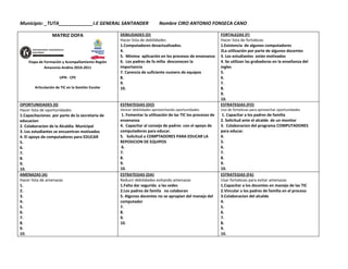 Este documento presenta una matriz DOFA para la Institución Educativa General Santander identificando sus debilidades, fortalezas, oportunidades y amenazas con respecto al uso de las tecnologías de la información y la comunicación (TIC) en los procesos educativos. Algunas debilidades incluyen computadores desactualizados y la falta de aplicación de las TIC en la enseñanza. Entre las fortalezas se encuentra la existencia de algunos computadores y que los estudiantes están motivados. Oportunidades como capacitaciones y apoyo del
