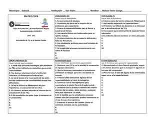 Este documento presenta una matriz DOFA para analizar las debilidades, fortalezas, oportunidades y amenazas de la institución educativa San Isidro en relación con la integración de las TIC. Identifica debilidades como el escaso número de equipos y la falta de interés de los profesores en capacitarse. También destaca fortalezas como las buenas relaciones con la administración municipal y la disposición de algunos docentes a actualizarse. Propone estrategias como gestionar equipos con el municipio, delegar responsabilidades del rector y aprovechar