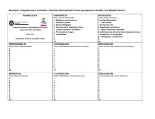 El documento presenta una matriz DOFA para analizar las debilidades, fortalezas, oportunidades y amenazas de la Institución Educativa Nacionalizada Técnica Agropecuaria José Miguel Suárez A. En la matriz se enumeran categorías para cada uno de estos elementos internos y externos de la institución, y se proponen estrategias para aprovechar fortalezas y oportunidades, y para reducir debilidades y evitar amenazas.