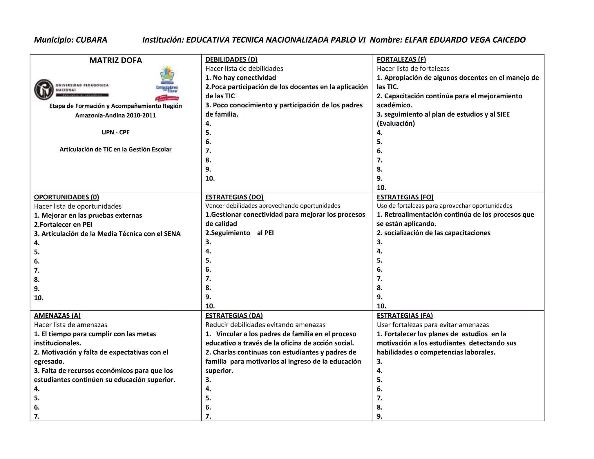 Este documento presenta un análisis DOFA de una institución educativa en Ecuador. Identifica como debilidades la falta de conectividad y participación de docentes y padres en el uso de TIC. Entre las fortalezas están la apropiación de algunos docentes de TIC y la capacitación continua. Las oportunidades incluyen mejorar resultados en pruebas externas y articular la educación media con el SENA. Las estrategias se enfocan en gestionar conectividad, seguir el PEI y vincular a padres para motivar a estudiantes a