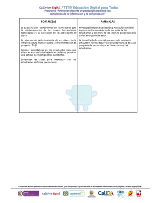 Este documento presenta una matriz DOFA para analizar la situación interna y externa del nuevo Ambiente de Aprendizaje Tecnológico del proyecto TIT@ EDPT. Identifica debilidades como la falta de un espacio dedicado para trabajar con estudiantes y conectividad internet insegura, así como oportunidades como implementar herramientas tecnológicas en la enseñanza. También destaca fortalezas como la capacitación de maestros y amenazas como daños a equipos por mal uso.