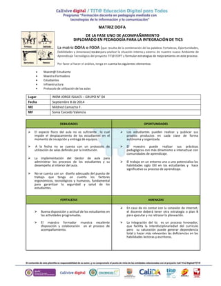 La matriz analiza las fortalezas, debilidades, oportunidades y amenazas de la implementación de las TIC en el aula del diplomado en pedagogía. Entre las debilidades se encuentran el espacio físico limitado del aula y la falta de un protocolo de uso de salas. Entre las oportunidades están la implementación de un gestor de aula y la posibilidad de que los estudiantes publiquen sus productos de forma autónoma. Las fortalezas incluyen la buena disposición de los estudiantes y del maestro formador, mientras