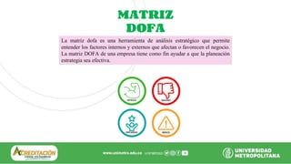 La matriz DOFA es una herramienta de análisis estratégico que permite entender los factores internos y externos que afectan una organización. Se divide en cuatro cuadrantes para analizar las fortalezas, debilidades, oportunidades y amenazas. Ayuda a las organizaciones a tomar mejores decisiones estratégicas mediante la evaluación de los factores que podrían afectar el logro de sus objetivos o donde podrían tener ventaja competitiva.
