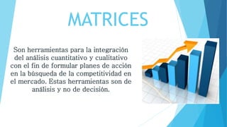 El documento presenta una introducción a las matrices EFE, EFI y PEYEA, que son herramientas para integrar análisis cuantitativo y cualitativo con el fin de formular planes de acción estratégicos. La matriz EFE evalúa factores externos, la matriz EFI evalúa factores internos, y la matriz PEYEA define la posición estratégica actual y la estrategia más adecuada. Se explican los pasos para elaborar cada matriz, incluyendo la lista y ponderación de factores, y la interpretación de los cuadrantes en la matriz P