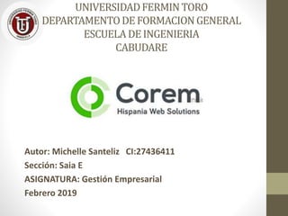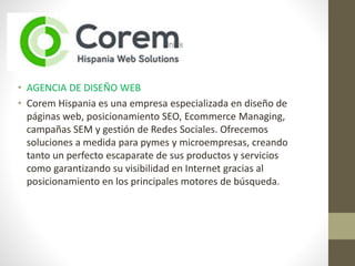 Este documento resume los servicios de una agencia de diseño web llamada Corem Hispania, incluyendo el diseño de páginas web, posicionamiento SEO, comercio electrónico, campañas SEM y redes sociales. También describe las fortalezas de la agencia como la personalización, rapidez y tarifas ajustadas, así como su equipo de profesionales. Incluye un análisis FODA para identificar fortalezas, debilidades, oportunidades y amenazas de la empresa.