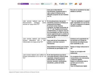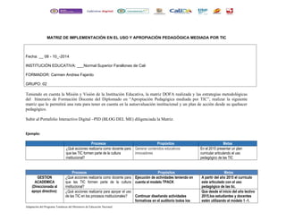 El documento presenta una matriz de implementación para el uso y apropiación pedagógica de las TIC en una institución educativa. La matriz contiene preguntas sobre acciones que los docentes podrían realizar en diferentes procesos como la gestión académica, la comunidad educativa y la evaluación de aprendizajes, con el fin de integrar las TIC. El documento también incluye un portafolio de recursos educativos digitales que los docentes podrían usar en su práctica.