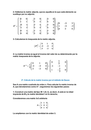 La matriz inversa de una matriz A satisface que A x A-1 = A-1 x A = I, la matriz identidad. Existen dos métodos para calcular la matriz inversa: 1) mediante el cálculo de determinantes y la matriz adjunta, y 2) mediante el método de Gauss, que construye una matriz concatenando A e I y aplica operaciones de filas para convertir A en I, dejando la inversa A-1 en la parte derecha.