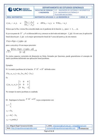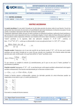 Este documento explica la matriz jacobiana, que es una matriz formada por las derivadas parciales de primer orden de una función. Se define la matriz jacobiana para funciones escalares y vectoriales, y se explica que representa la derivada de una función multivariable. También se introduce el determinante jacobiano y cómo indica si una función es localmente invertible.