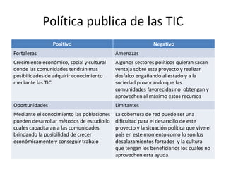 El documento presenta una matriz LOFA para analizar la política pública de las TIC. La matriz identifica fortalezas como el crecimiento económico, social y cultural que permitirá a las comunidades adquirir conocimiento a través de las TIC. También identifica oportunidades como que el conocimiento permita a las poblaciones desarrollar métodos de estudio y capacitarse para crecer económicamente. Sin embargo, señala amenazas como que algunos sectores políticos puedan desviar fondos y limitantes como problemas de cobertura de red.