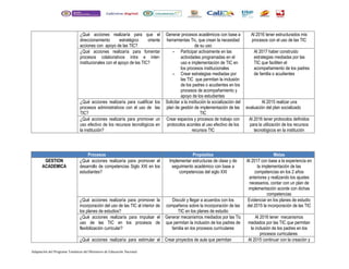 El documento presenta una matriz de implementación del uso pedagógico de las TIC en una institución educativa. La matriz incluye procesos, propósitos y metas relacionados con el uso de las TIC en gestión académica, la comunidad educativa y la evaluación de aprendizajes. El objetivo es que los maestros diligencien la matriz para tener una ruta que guíe la autoevaluación institucional y el plan de acción en su quehacer pedagógico con apoyo de las TIC. Adicionalmente, se solicita a los ma