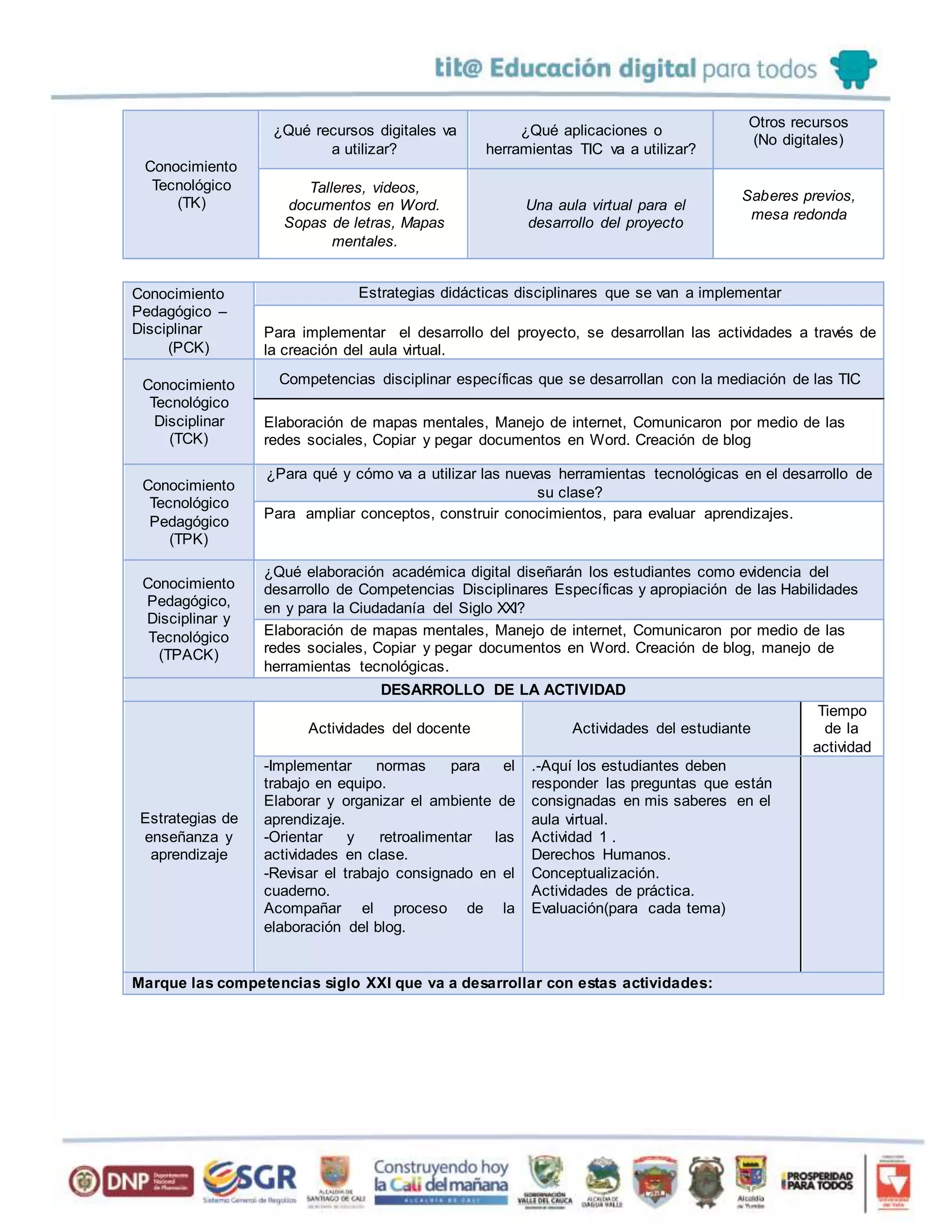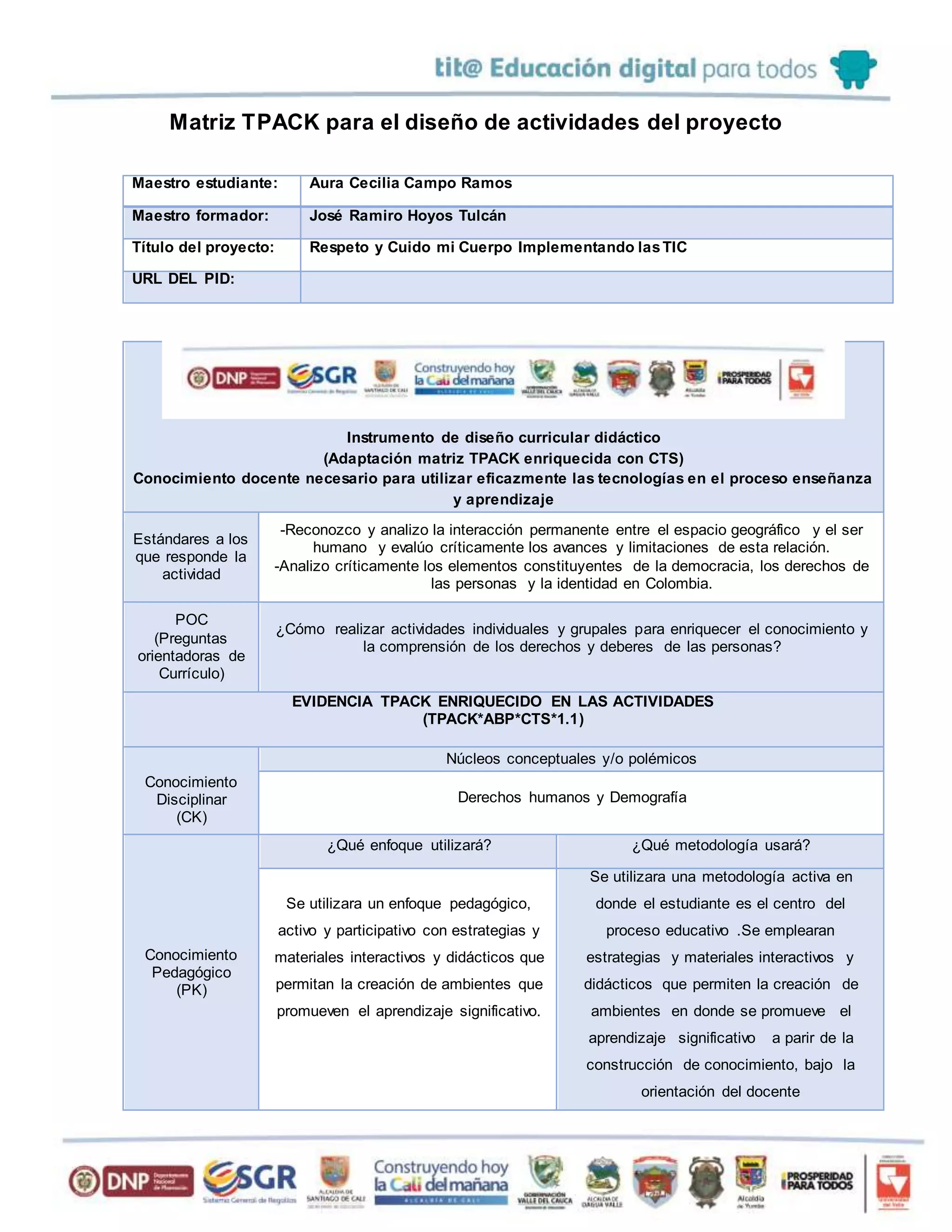 El documento presenta una matriz TPACK para el diseño de actividades de un proyecto sobre respeto y cuidado del cuerpo que implementa las TIC. La matriz describe los conocimientos disciplinares, pedagógicos y tecnológicos requeridos, así como las estrategias, actividades, evaluación y competencias del siglo XXI que se desarrollarán. El objetivo es ampliar conceptos y construir conocimientos a través de herramientas digitales como videos, documentos en Word y un blog.