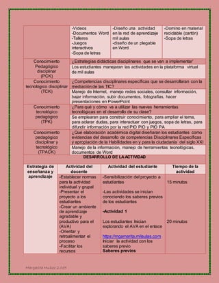 El documento presenta el diseño de actividades para un proyecto sobre cultura ambiental utilizando la matriz TPACK. Las actividades incluyen videos, juegos interactivos, talleres y trabajo en la plataforma Mil Aulas para enseñar sobre reciclaje, clasificación de desechos y cultura ambiental. El proceso evaluará la participación de los estudiantes, producciones y dominio de conceptos a través de rúbricas y de manera formativa.