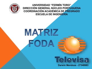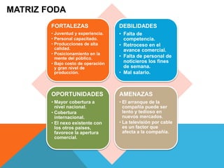 El documento presenta una matriz FODA para una empresa de medios de comunicación. Identifica sus fortalezas como la juventud y experiencia de su personal, producciones de alta calidad y bajo costo de operación. Señala como debilidades la falta de competencia, retroceso comercial y falta de personal los fines de semana. Entre las oportunidades están mayor cobertura nacional e internacional. Las amenazas son el arranque lento en nuevos mercados y la competencia de la televisión por cable.