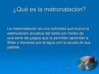 La matronatación es una actividad acuática para estimular a bebés a través de juegos que les permiten aprender a flotar y moverse en el agua con la ayuda de sus padres. Se recomienda empezar a los 4 meses para que el sistema inmunológico esté más desarrollado. Los beneficios incluyen relajación, mejora de la sociabilización con los padres e inteligencia. Los padres juegan un rol activo de acompañamiento y cuidado durante las clases de 30-45 minutos que incluyen actividades como