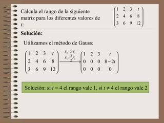 Solución: Calcula elrango de la siguiente matriz para los diferentes valores de t : Utilizamos el método de Gauss: Solución: si t = 4 el rango vale 1, si t 4 el rango vale 2