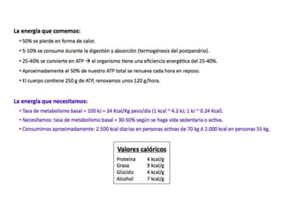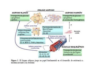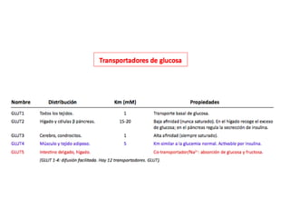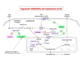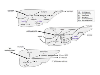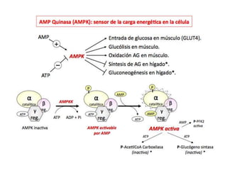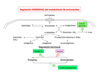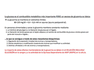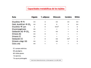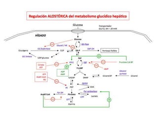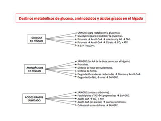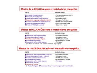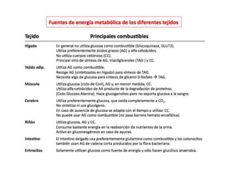 El documento proporciona una panorámica general de la integración del metabolismo, incluyendo las rutas metabólicas de diferentes órganos, los puntos de conexión clave y moléculas, y cómo las enzimas del metabolismo de la glucosa, ácidos grasos y aminoácidos están reguladas hormonalmente. También describe cómo las principales rutas metabólicas cambian en diferentes condiciones y las fases de la homeostasis de la glucosa durante el ayuno prolongado.