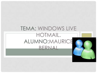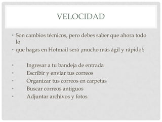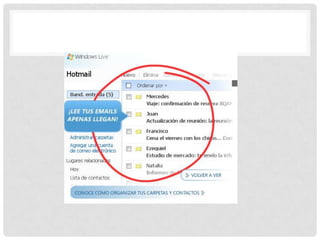 Este documento describe las mejoras recientes en el servicio de correo electrónico Hotmail de Windows Live. Entre las mejoras se incluyen una mayor velocidad al acceder a la bandeja de entrada, escribir y enviar correos, organizar correos en carpetas y buscar correos antiguos. También incluye mayor almacenamiento en la nube, un filtro anti-spam mejorado, actualizaciones automáticas de la bandeja de entrada, y una mejor organización de correos de trabajo o estudios en carpetas. Además, permite el acceso m