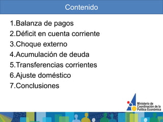 El documento analiza la balanza de pagos y la cuenta corriente de Ecuador. Explica que Ecuador ha tenido un déficit en su balanza de pagos y cuenta corriente por varios años, llegando a más del 40% del PIB en algunos años. El déficit se debe principalmente a un deterioro en los términos de intercambio y una desaceleración del comercio mundial, lo que ha afectado las exportaciones de Ecuador.