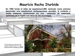 Mauricio Rocha Iturbide es un arquitecto mexicano nacido en 1965. Estudió arquitectura en la UNAM y ha impartido clases en varias universidades. En 1998 fundó su propio taller de arquitectura con el objetivo de desarrollar una arquitectura contemporánea sensible al contexto y medio ambiente. Algunos de sus principales proyectos incluyen la Escuela para Invidentes y Débiles Visuales y el Museo de Cine de la Cineteca Nacional.
