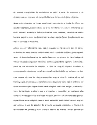 MAUS de Art Spiegelman es una novela gráfica que narra el Holocausto desde una perspectiva psicológica e íntima. A través de viñetas en blanco y negro y la metáfora de los judíos como ratones y los nazis como gatos, la obra explora los temas del amor filial, el crecimiento emocional y la reconstrucción de la memoria histórica desde una experiencia personal y familiar. El uso sofisticado de recursos como encuadres, angulaciones y tipografía crea un lenguaje visual que intens