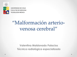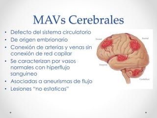 Una malformación arteriovenosa cerebral (MAV) es un defecto del sistema circulatorio cerebral presente desde el desarrollo embrionario que conecta arterias y venas sin una red capilar intermediaria, causando un hiperflujo sanguíneo. Puede presentarse con hemorragia, cefalea, epilepsia u otros síntomas. Su diagnóstico se realiza principalmente con angiografía, resonancia magnética o angiotomografía computarizada, que permiten visualizar el "nidus" anormal y caracterizar la lesión.