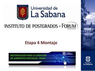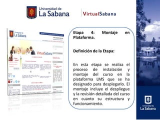 Este documento describe la etapa 4 de montaje de un curso en una plataforma LMS. En esta etapa se instala y despliega el curso en la plataforma, se revisa su estructura y funcionamiento, y se prueba a través de pilotos antes de publicarlo a los estudiantes. El proceso incluye preparar la plataforma, desplegar los componentes del curso, y evaluarlo según criterios como funcionalidad y usabilidad.