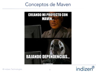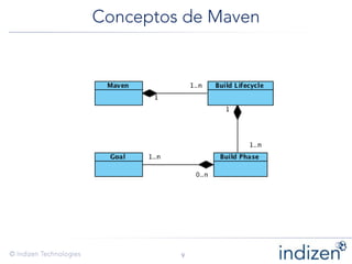 Maven es una herramienta para la gestión y construcción de proyectos Java creada por Jason Van Zyl. Permite describir el proyecto, sus dependencias y configuración a través de un archivo XML llamado pom.xml. Maven usa repositorios para descargar dependencias y gestiona el ciclo de vida del proyecto a través de fases como compilación, pruebas y empaquetado.