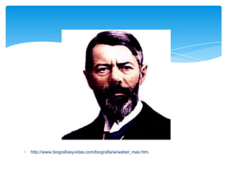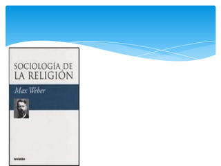 Max Weber analizó la relación entre el protestantismo y el espíritu del capitalismo. Argumentó que ciertos valores protestantes como el trabajo duro, la disciplina y el ahorro beneficiaron el desarrollo del capitalismo. También desarrolló la noción de tipos ideales para estudiar sociológicamente diferentes formas de dominación legítima como la burocracia, la tradición y el carisma.