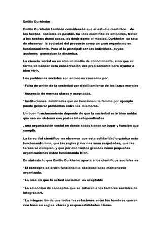 Max Weber propuso una teoría de la acción social que considera los motivos, pensamientos y sentimientos de los individuos, en contraste con las teorías materialistas de Marx y Durkheim. Durkheim veía la sociedad como un organismo funcional donde los individuos mantienen el orden a través de normas compartidas. Marx analizó cómo las formas de producción y distribución de riqueza influyen en la conciencia social y propuso que el capitalismo sería reemplazado por un sistema mejor.