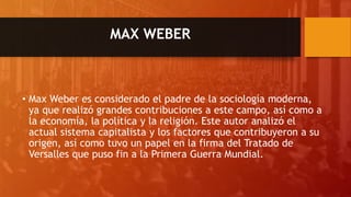 Max Weber es reconocido como el padre de la sociología moderna, destacando por sus estudios sobre el capitalismo y la autoridad. Definió tres tipos de autoridad: tradicional, carismática y legal-racional, y desarrolló un modelo burocrático que enfatiza la eficiencia organizacional. Su obra y aportes a la administración fueron valorados significativamente después de su muerte en 1920.