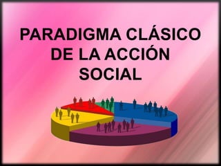 Este documento resume los conceptos clave del paradigma clásico de la acción social de acuerdo a Max Weber. Describe la acción social y la interacción social, así como el enfoque subjetivo de Weber que busca entender los fenómenos sociales desde la perspectiva de los actores. También examina los conceptos de la burocracia, la racionalización de la sociedad, y la distinción de Weber entre clases, estatus y poder.