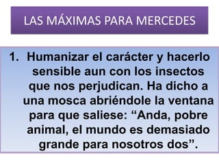 San Martín proporciona 12 máximas para educar a Mercedes. Estas incluyen humanizar el carácter e inspirar compasión hacia todos los seres vivos, incluso los insectos; enseñarle a amar la verdad y odiar la mentira; fomentar la confianza y el respeto hacia los demás; estimular la caridad hacia los pobres; respetar la propiedad ajena; guardar secretos; ser indulgente con todas las religiones; ser amable con los sirvientes, pobres y ancianos; hablar solo lo necesario; comportarse