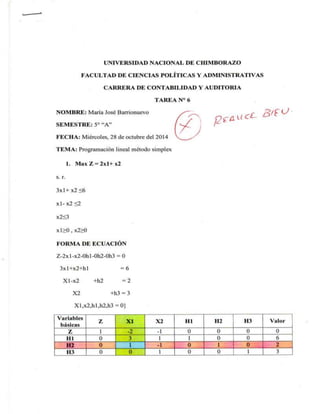 Este documento presenta un problema de programación lineal para una empresa mueblera. El objetivo es maximizar las utilidades produciendo mesas, sillas, camas y bibliotecas, sujeto a restricciones en los recursos disponibles. Se resuelve el problema usando el método simplex, determinando que la solución óptima es producir 5 mesas, 4 sillas, 2 camas y 1 biblioteca.