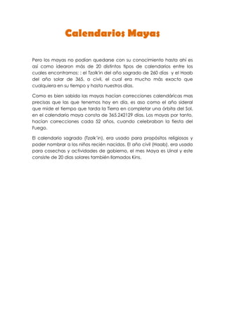 La civilización Maya tuvo grandes avances en matemáticas e ideó sistemas calendáricos más precisos que los actuales. Desarrollaron un sistema numérico de base veinte con el cinco como base auxiliar y crearon más de 20 calendarios, incluyendo el Tzolk'in de 260 días para propósitos religiosos y el Haab de 365 días para cosechas y gobierno. Los Mayas hacían correcciones calendáricas cada 52 años que eran más precisas que las actuales.