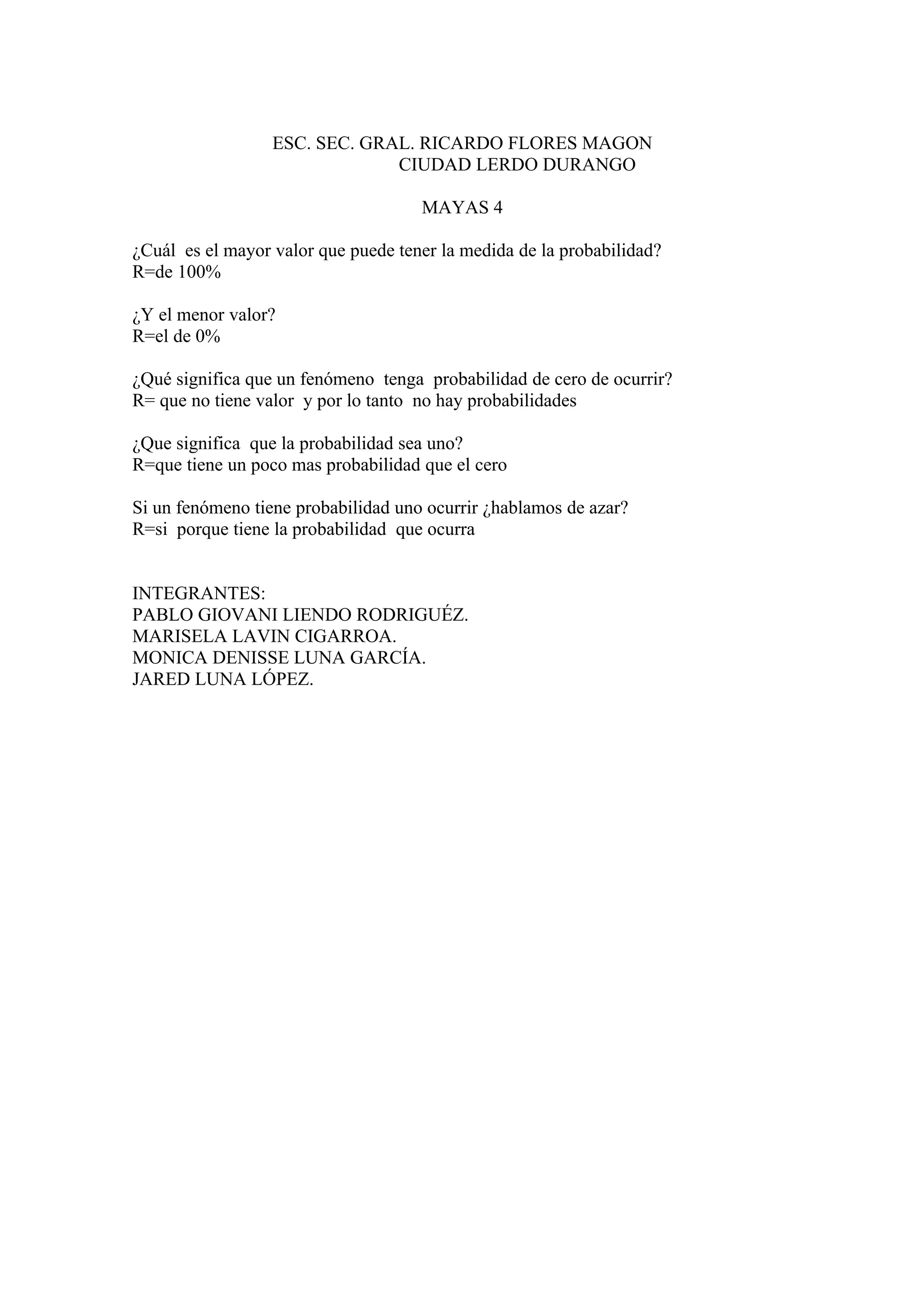 El documento discute los valores extremos que puede tomar la probabilidad de un evento. Un evento con probabilidad de 0% no tiene posibilidad de ocurrir, mientras que uno con probabilidad de 100% es seguro que ocurra. Un evento con probabilidad de 1 tiene una pequeña posibilidad mayor que 0, por lo que todavía implica cierto grado de azar. El documento también lista los nombres de cuatro integrantes.