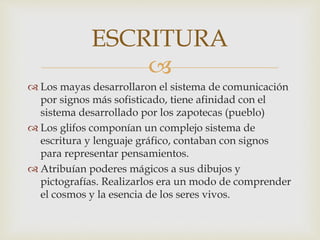 El documento resume aspectos clave de la cultura maya, incluyendo su sistema de escritura basado en glifos, su uso de códices y calendarios, sus avances en matemáticas y astronomía, su arquitectura religiosa prominente, y el papel de los sacrificios humanos y el juego de pelota en sus rituales.