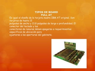 Los diferentes tipos de tarjetas madre incluyen las tarjetas madre Full AT originales de IBM, las versiones más pequeñas Baby AT, las tarjetas madre LPX de bajo perfil para computadoras de escritorio delgadas, las tarjetas madre ATX más recientes que permiten mejor ventilación y actualización del procesador, y las tarjetas madre Micro ATX aún más pequeñas desarrolladas para el mercado de gama baja a media. El documento también menciona varias marcas populares de tarjetas madre como ASUS, Intel, MSI y ASRock.