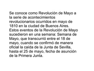 La Revolución de Mayo se refiere a la serie de eventos revolucionarios que ocurrieron en mayo de 1810 en Buenos Aires, Argentina, que incluyeron la caída de la Junta de Sevilla y la asunción de la Primera Junta, los cuales tuvieron lugar durante la conocida Semana de Mayo.