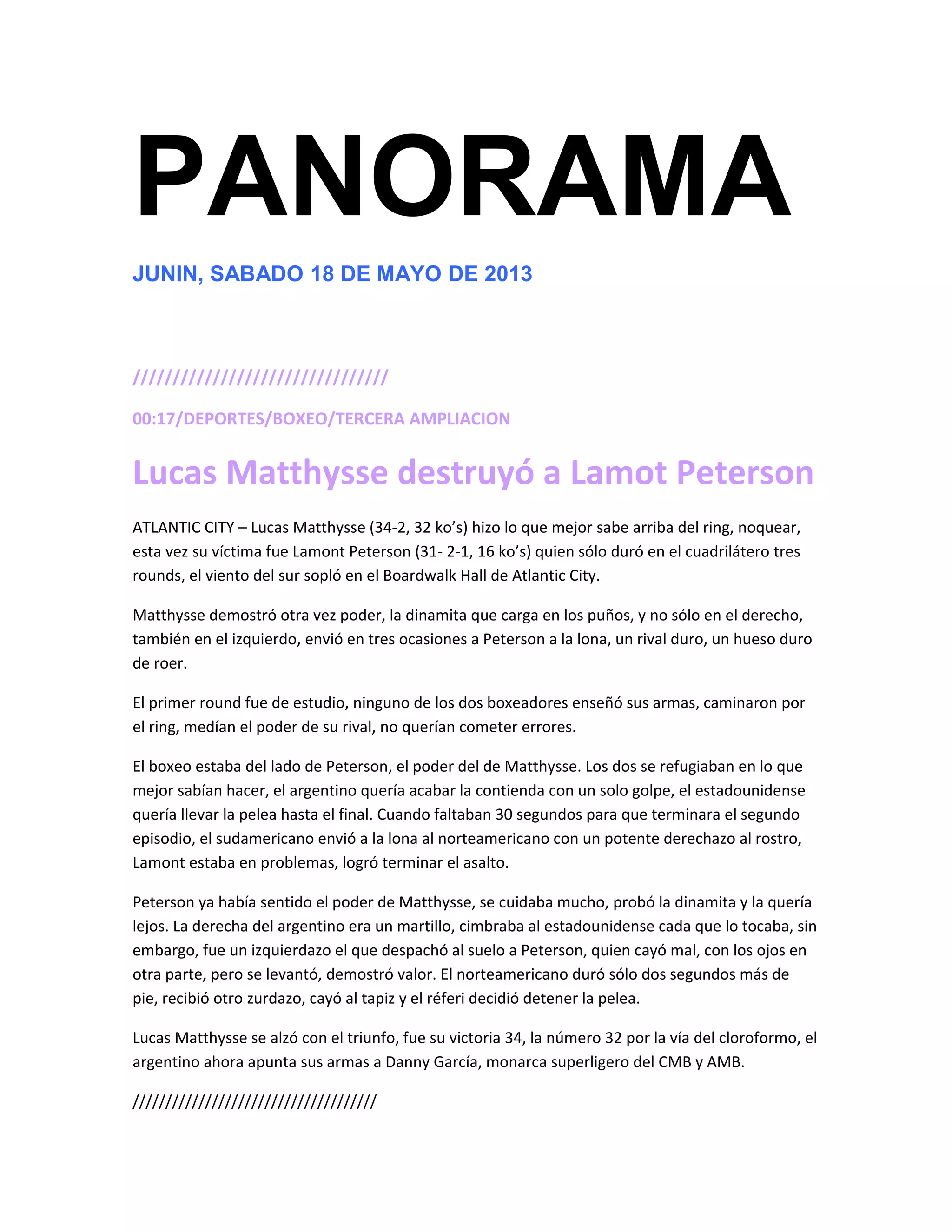 Lucas Matthysse noqueó en el tercer round a Lamont Peterson en Atlantic City. Matthysse demostró su poderoso golpe al enviar a Peterson a la lona tres veces antes de que el árbitro detuviera la pelea. Con esta victoria, Matthysse espera ahora poder enfrentar al campeón Danny García en septiembre.