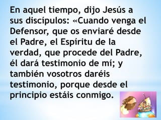 Jesús les dice a sus discípulos que cuando venga el Espíritu Santo, les dará testimonio de Él y los discípulos también darán testimonio. Jesús les advierte que serán perseguidos y excomulgados de la sinagoga, e incluso podrían ser asesinados, aunque sus perseguidores crean que honran a Dios con esto. Jesús les habla de esto para que cuando llegue la hora se acuerden de Sus palabras.