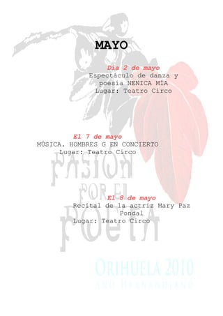 Este documento presenta la programación cultural de mayo en Orihuela, incluyendo espectáculos de danza, poesía, teatro, música y conciertos corales en homenaje al poeta Miguel Hernández en diferentes lugares como el Teatro Circo y La Lonja. También se llevará a cabo un seminario internacional sobre ciudades históricas del Mediterráneo.