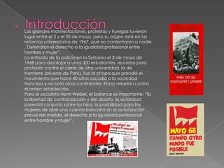 El documento describe las protestas estudiantiles y huelgas obreras que ocurrieron en Francia en mayo de 1968, conocidas como los sucesos de mayo. La policía desalojó estudiantes protestando en La Sorbona el 3 de mayo, encendiendo el movimiento. Estudiantes y trabajadores se unieron en huelga general el 13 de mayo, exigiendo reformas. Aunque De Gaulle ganó las elecciones de junio, pronto renunció, marcando el fin de su estilo de liderazgo personalista y dando inicio a un period