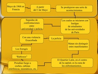La revuelta de mayo de 1968 en Francia comenzó como huelgas estudiantiles en la Universidad de París y luego se extendió a enfrentamientos violentos entre manifestantes y policía en el centro de la capital. Varios grupos políticos de izquierda y anarquistas se unieron a las protestas contra el consumismo, la sociedad capitalista y en demanda de libertad y justicia. Aunque el gobierno intentó restablecer el orden enviando fuerzas especiales, las protestas continuaron intensificándose con más de diez millones de adherentes.