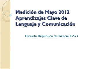 El documento presenta los resultados de las pruebas de lenguaje y comunicación aplicadas en mayo de 2012 a estudiantes de diferentes grados (NT1, NT2, 1o, 2o, 3o, 4o y 5o años) de la Escuela República de Grecia. Se muestran los porcentajes de estudiantes que lograron el 70% o más de exigencia, y los que no lograron ese puntaje mínimo, en diferentes áreas evaluadas como aproximación a la lectura, reconocimiento de signos escritos, extracción de información de textos y otros