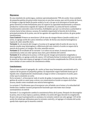 El documento detalla la elaboración de mayonesa casera como un experimento para entender emulsiones, utilizando yema de huevo, vinagre y aceite en diferentes variantes. Se comparan las texturas y características de la mayonesa obtenida con métodos distintos, destacando la importancia de la emulsificación adecuada. Las conclusiones subrayan que la velocidad y forma en que se incorpora el aceite afectan significativamente la consistencia de la emulsión.