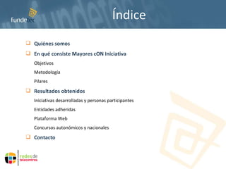 La Fundación Fundetec promueve el acceso a las tecnologías de la información para ciudadanos y empresas en España, especialmente a través del programa 'Mayores con Iniciativa', que busca integrar a personas mayores en la sociedad digital. Este programa se centra en desarrollar habilidades tecnológicas en mayores, logrando la participación activa de más de 13,000 visitantes en su plataforma web y organizando concursos autonómicos y nacionales. A partir de 2011, el programa continúa su labor, reforzando su compromiso con la inclusión digital de este colectivo.