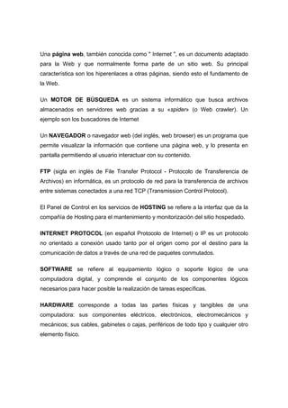 Este documento define varios términos relacionados con las aplicaciones web 2.0 y la tecnología educativa, incluyendo B-Learning, e-learning, uLearning, m-learning, HTML, URL, páginas web, motores de búsqueda, navegadores, FTP, protocolo IP, software, hardware, redes sociales, sistema de nombres de dominio, campus virtual y tecnologías de la información y comunicación. También menciona la Free Software Foundation y su objetivo de proteger el software de código abierto.